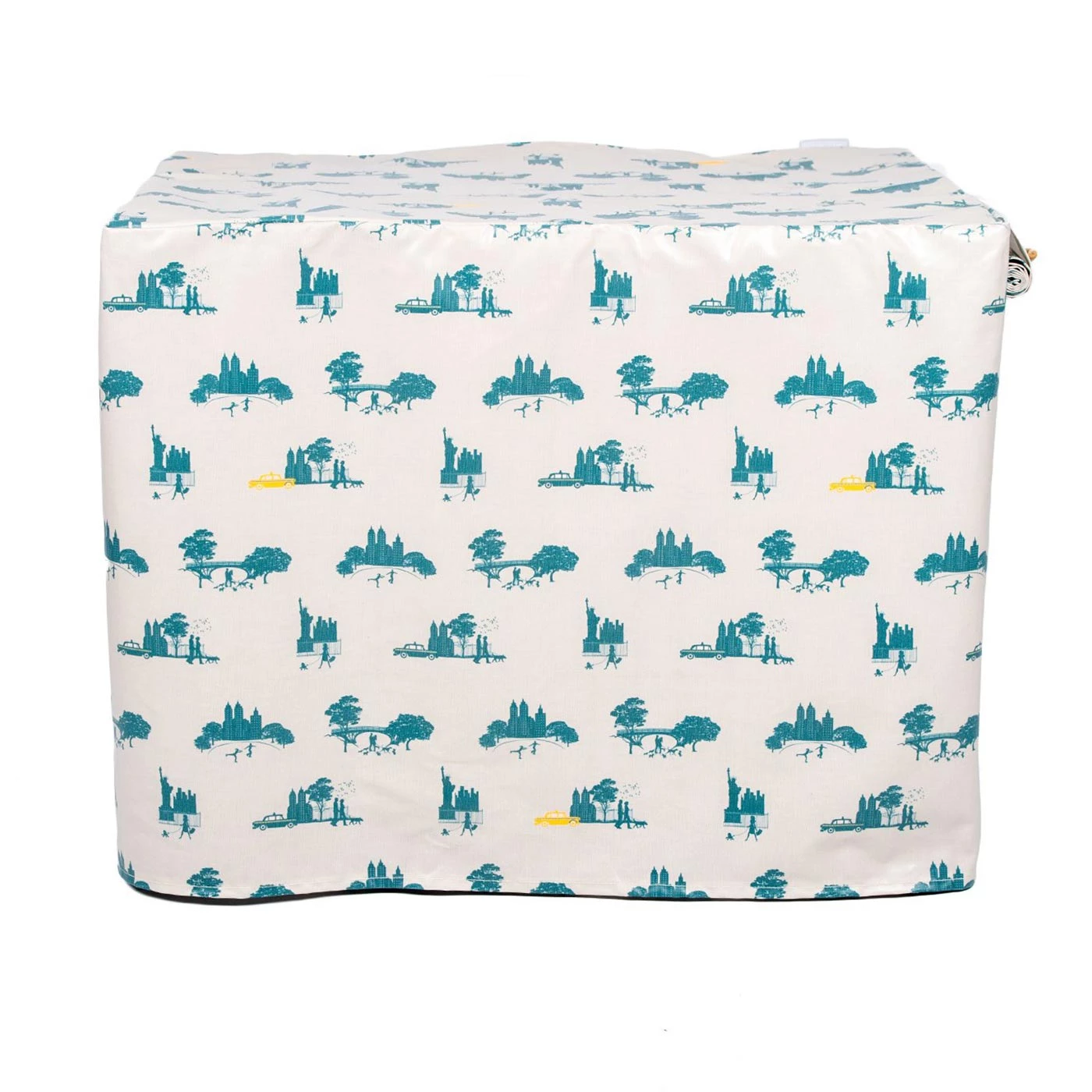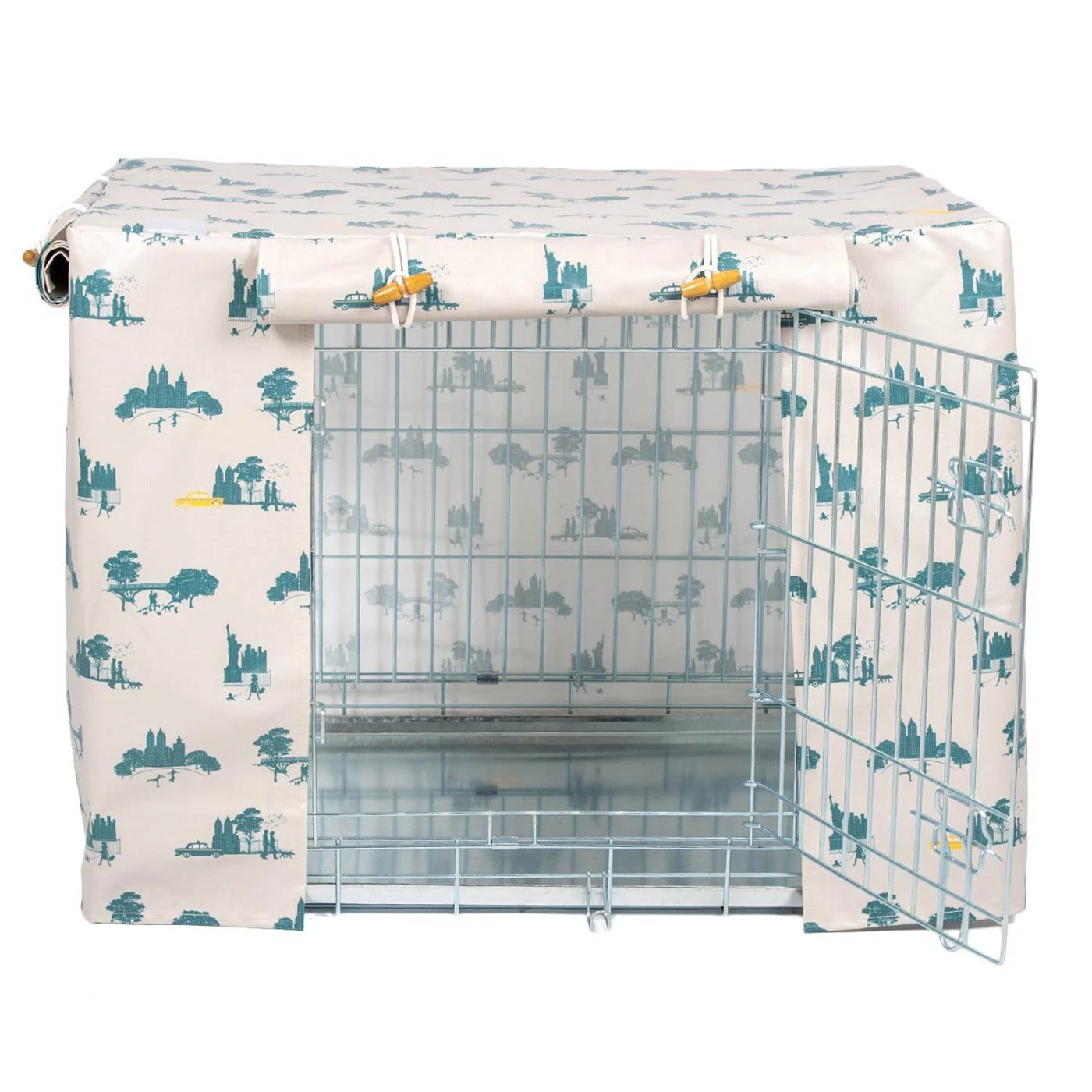 • Oilcloth dog crate cover with roll up doors
