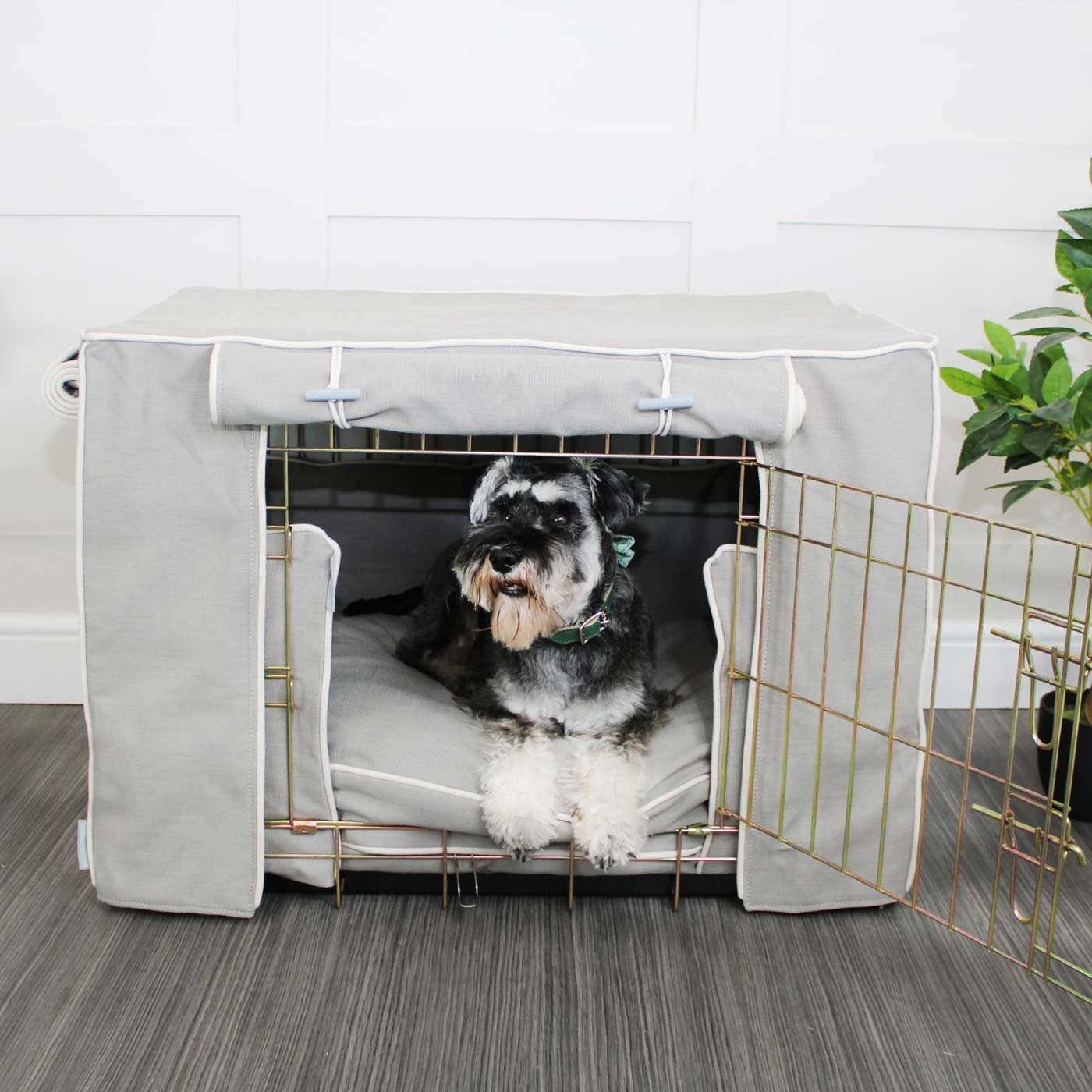 โข Fully lined cotton dog crate cover with roll up doors