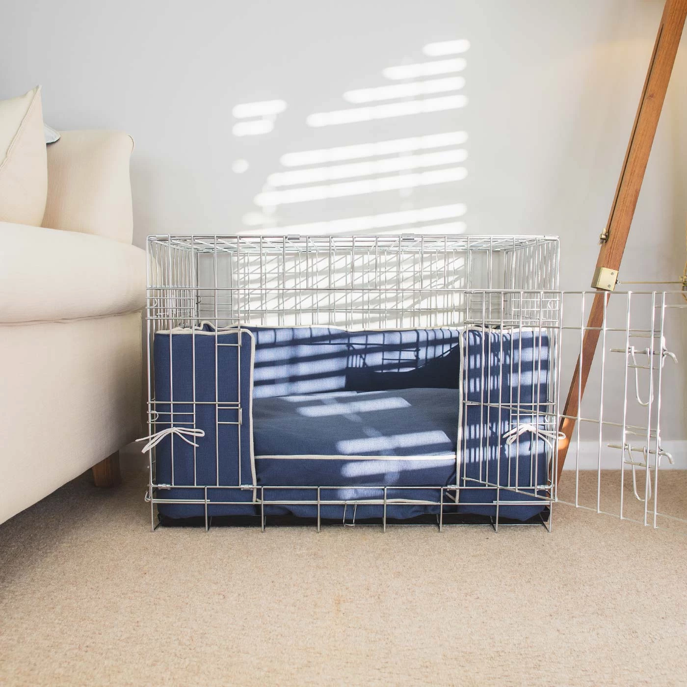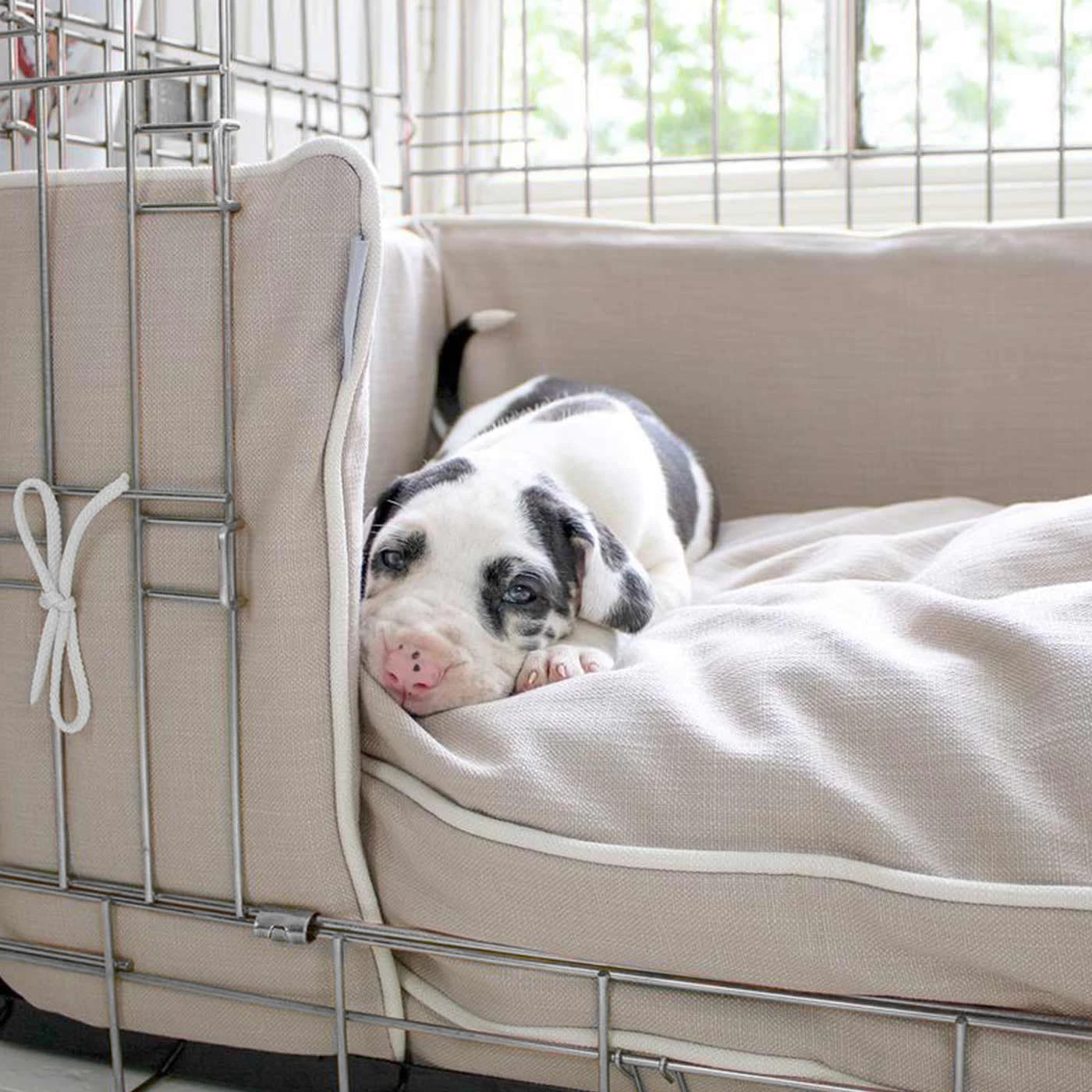 Set includes a silver dog crate,ย savanna cushion and bumper only
