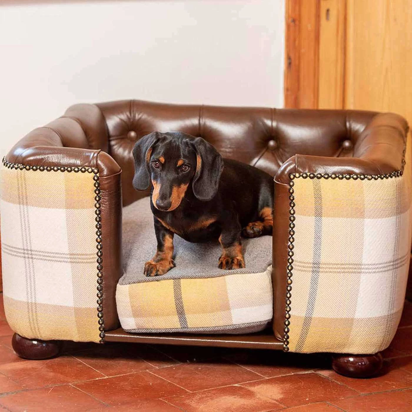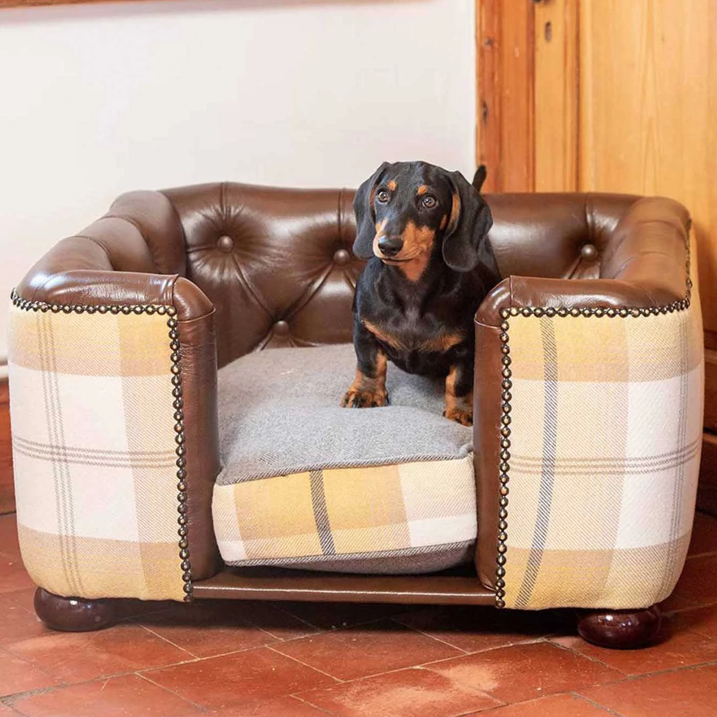 Outlet 🔥 Lords & Labradors Personalised Tetford 🦮 Dog Chesterfield in Tan Leather & Ochre Ash Tweed ⌛