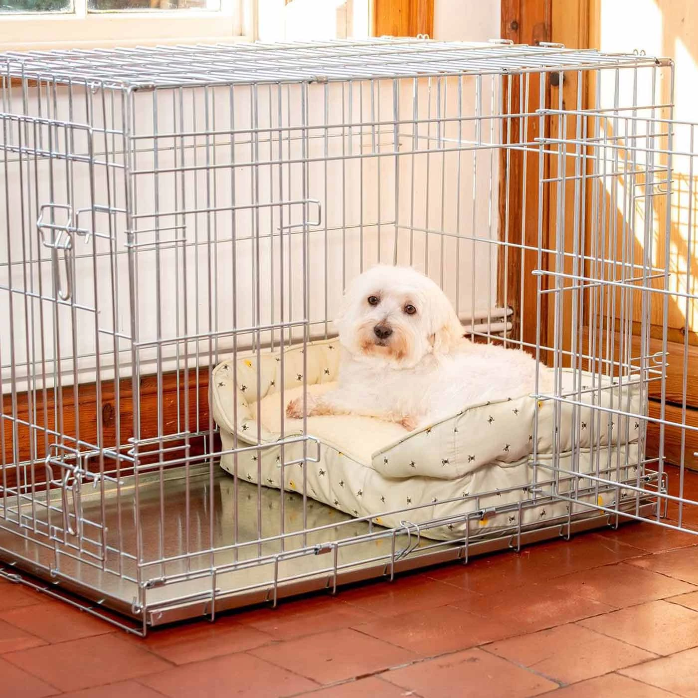 The Puppy Crate Bed by Lords & Labadors is a super plump and cosy luxury puppy bed, featuring a snuggly sherpa fleece top and cushioned walls so pup can rest his head comfortably.